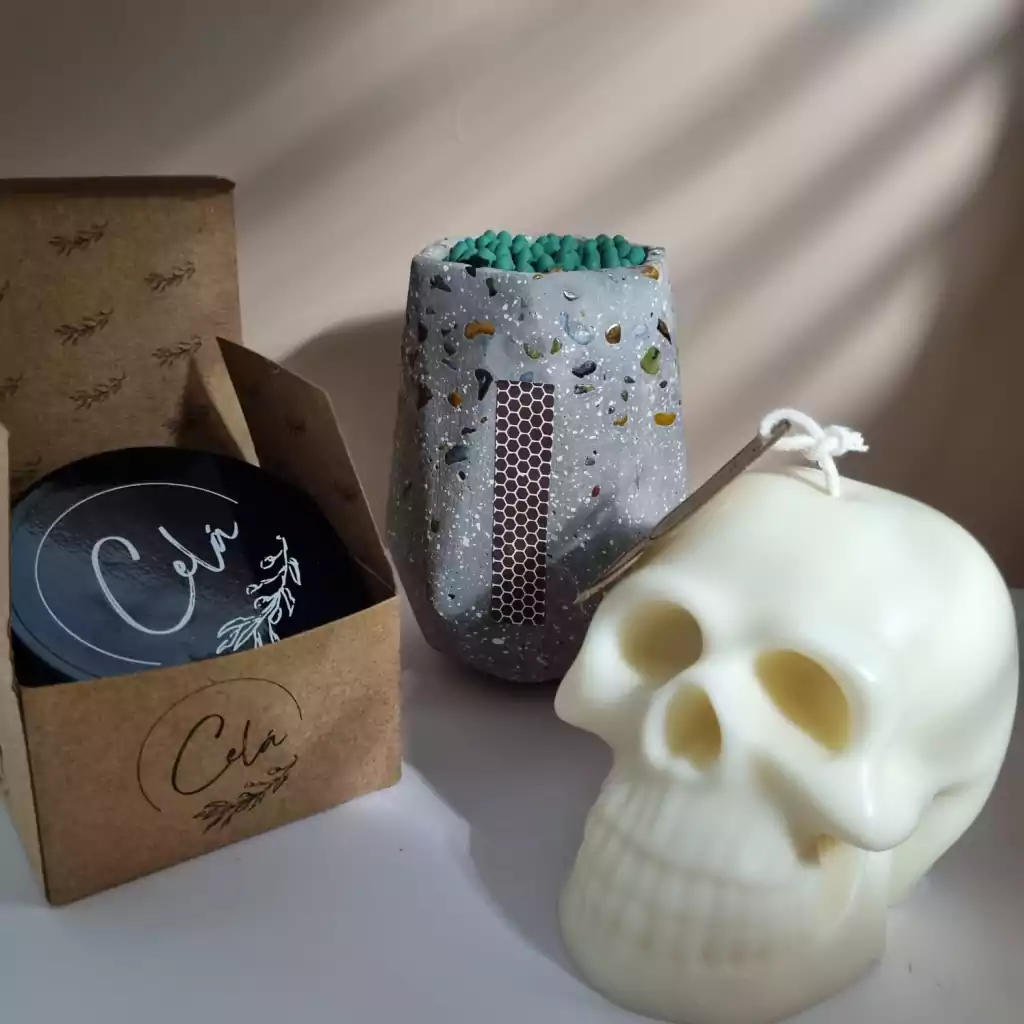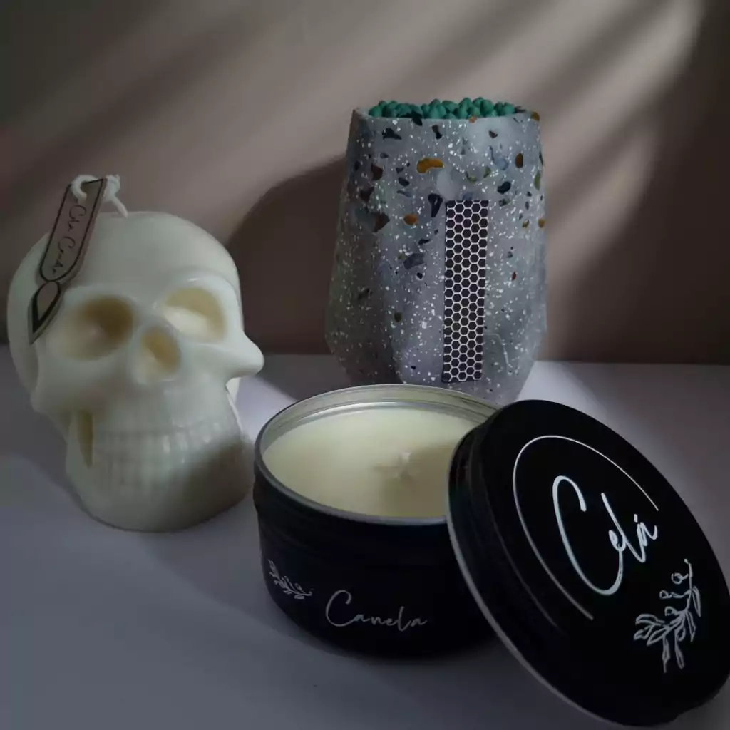 VELA COM AROMA DE LAVANDA + POCKET COLLECTION CANELA + ARTE EM CIMENTO COM PEDRAS NATURAIS